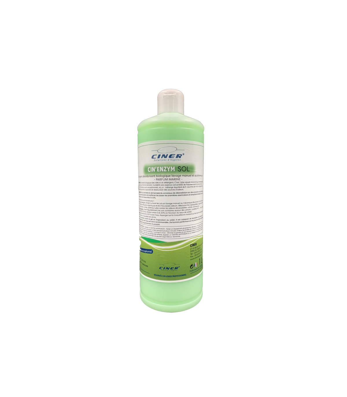 CIN’ENZYM SOL est un nettoyant biologique enzymatique destiné aux sols des parties communes, voiries, locaux techniques et zones à forte charge organique. Il combine action détergente et destruction biologique des sources d’odeurs.