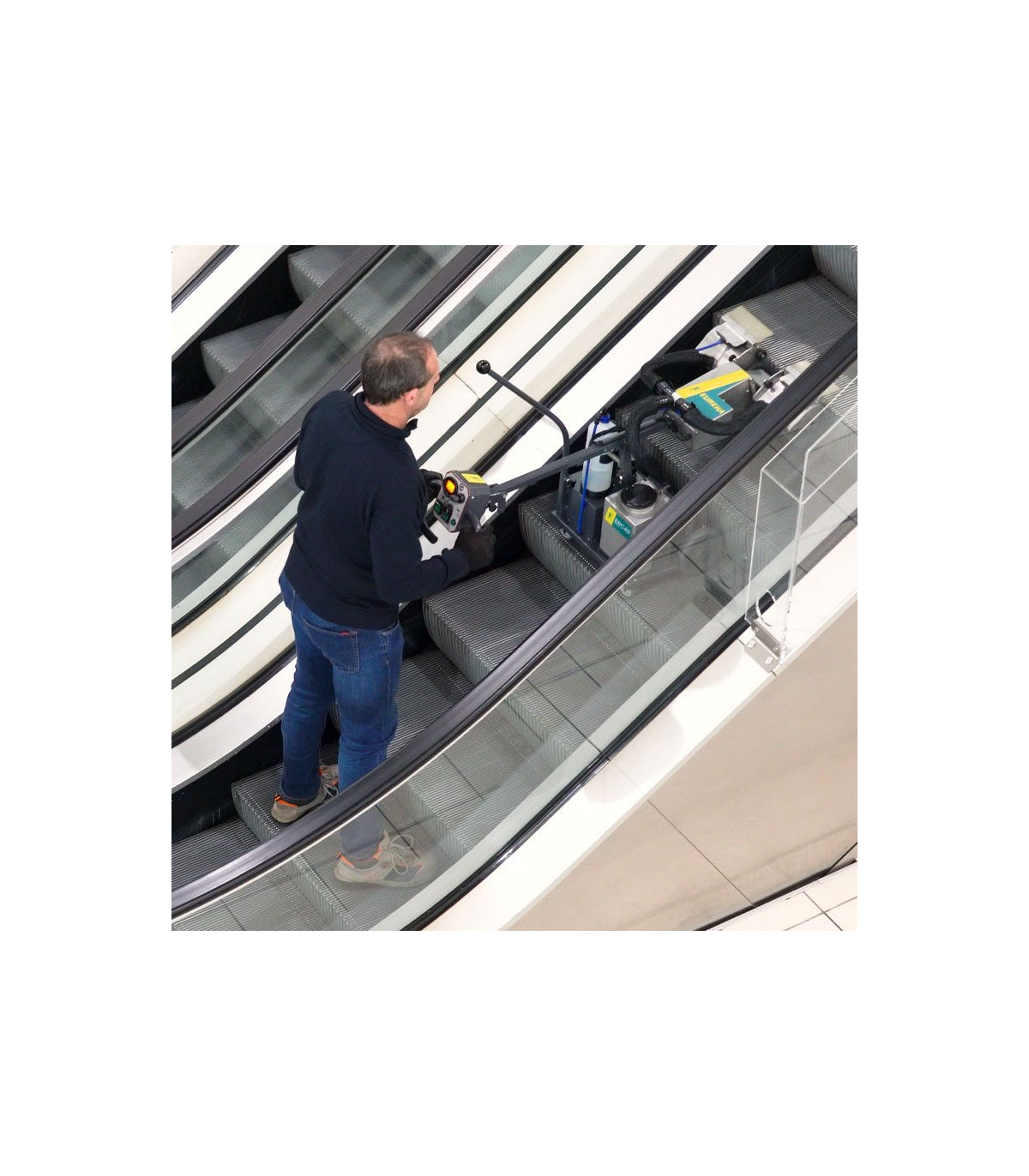 Utilisée seule, elle assure un nettoyage précis des élévateurs d’escalator. Utilisée en tandem avec la machine EUREKA EC52, elle permet à un seul opérateur de nettoyer deux escaliers mécaniques simultanément, avec un gain majeur de temps et de coût.